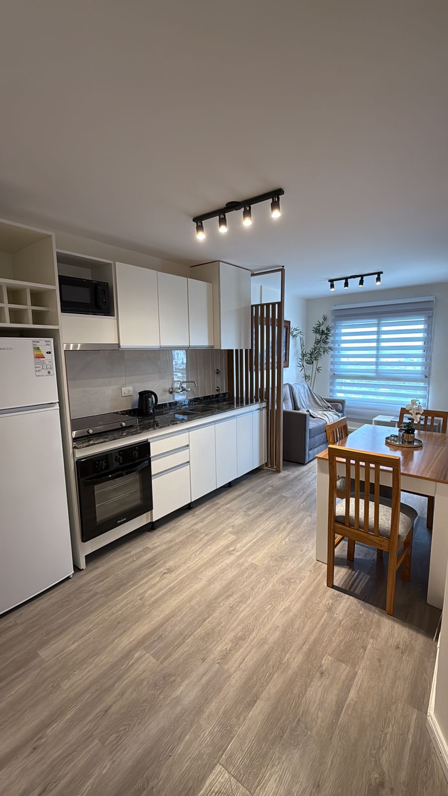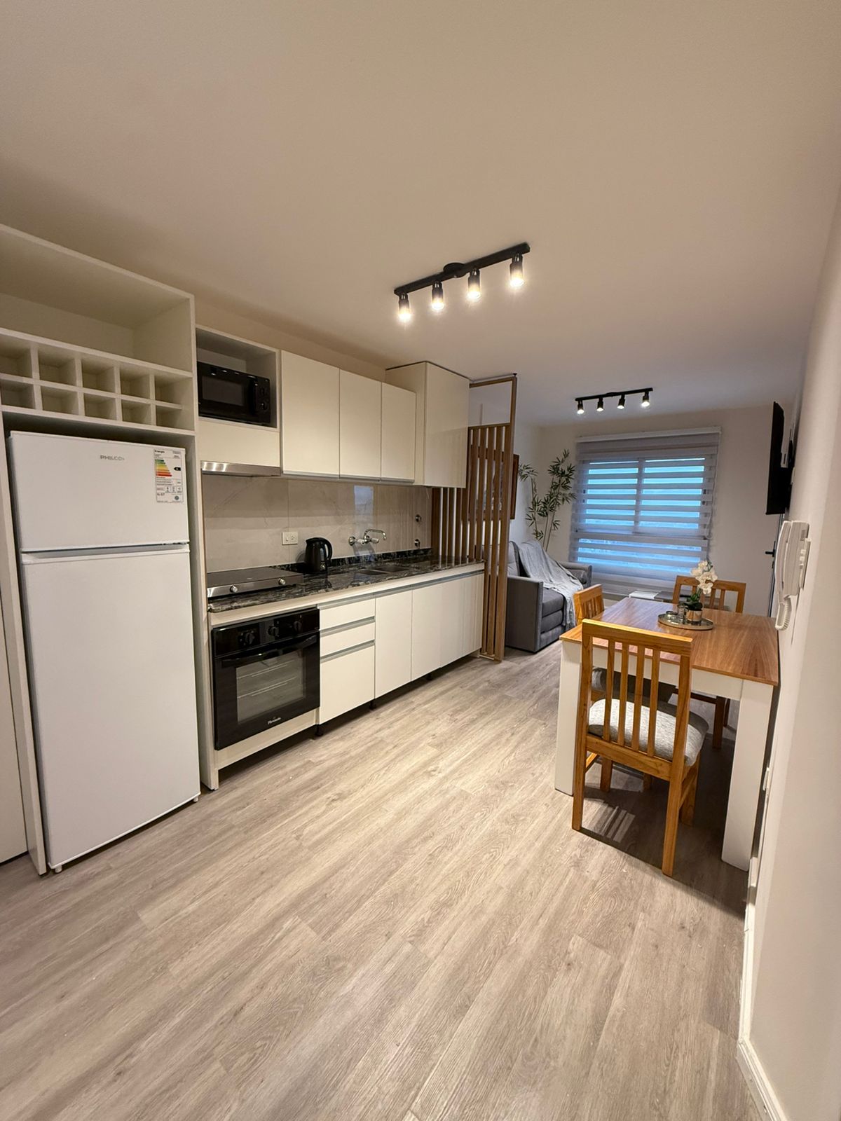 Cocina equipada, incluye horno, anafe, microondas y mobiliario completo.