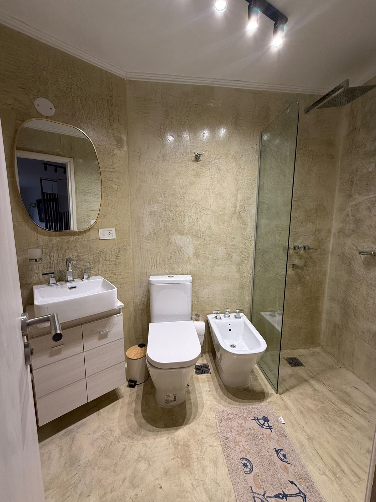 Baño completo con mampara fija, diseño moderno y funcional.