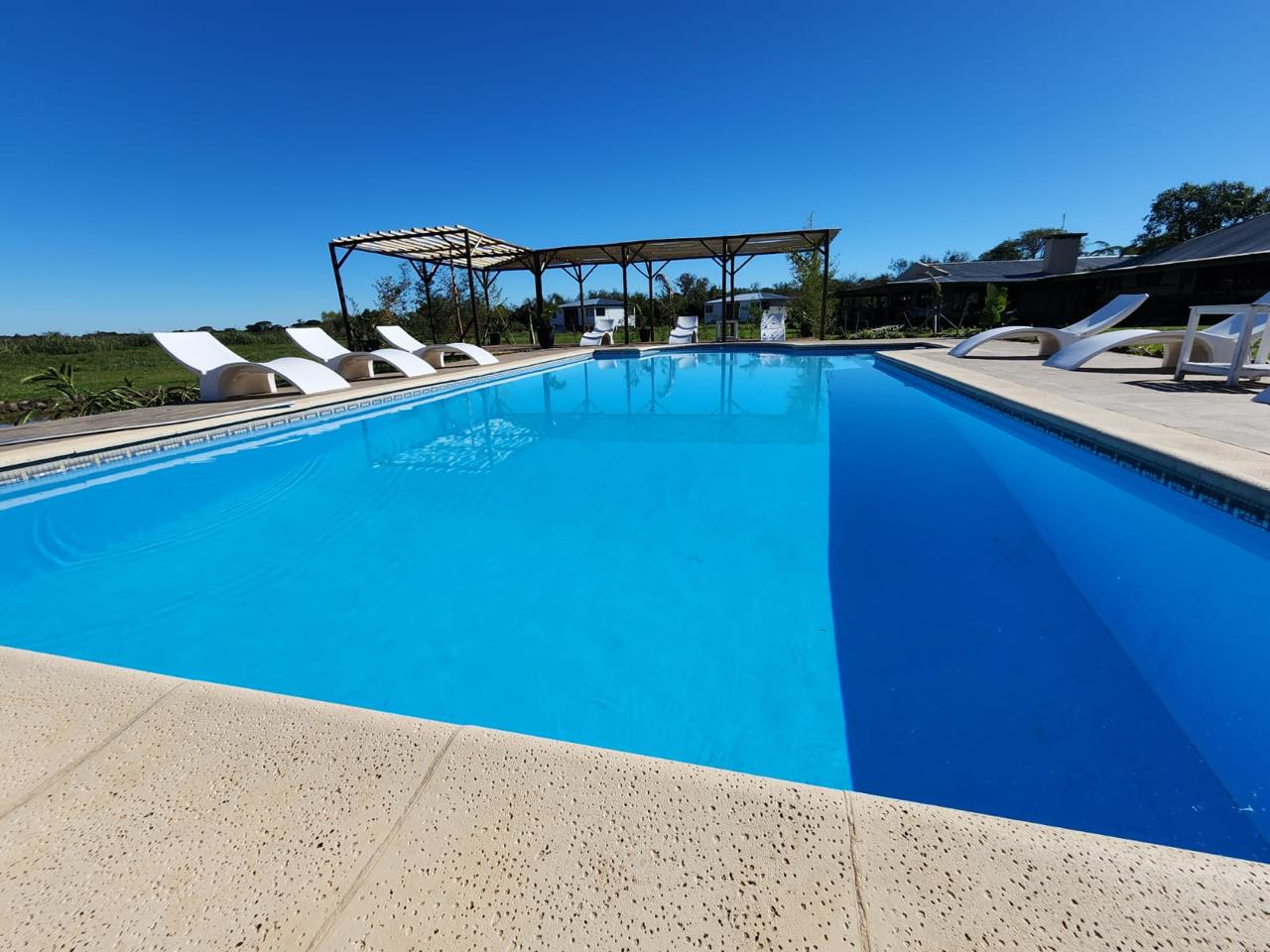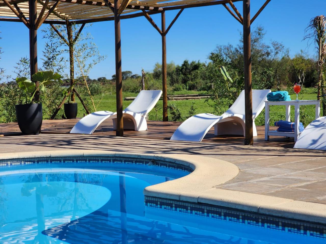 Piscina con solárium y muelle propio, punto estratégico para excursiones y safaris náuticos por los Esteros del Iberá.