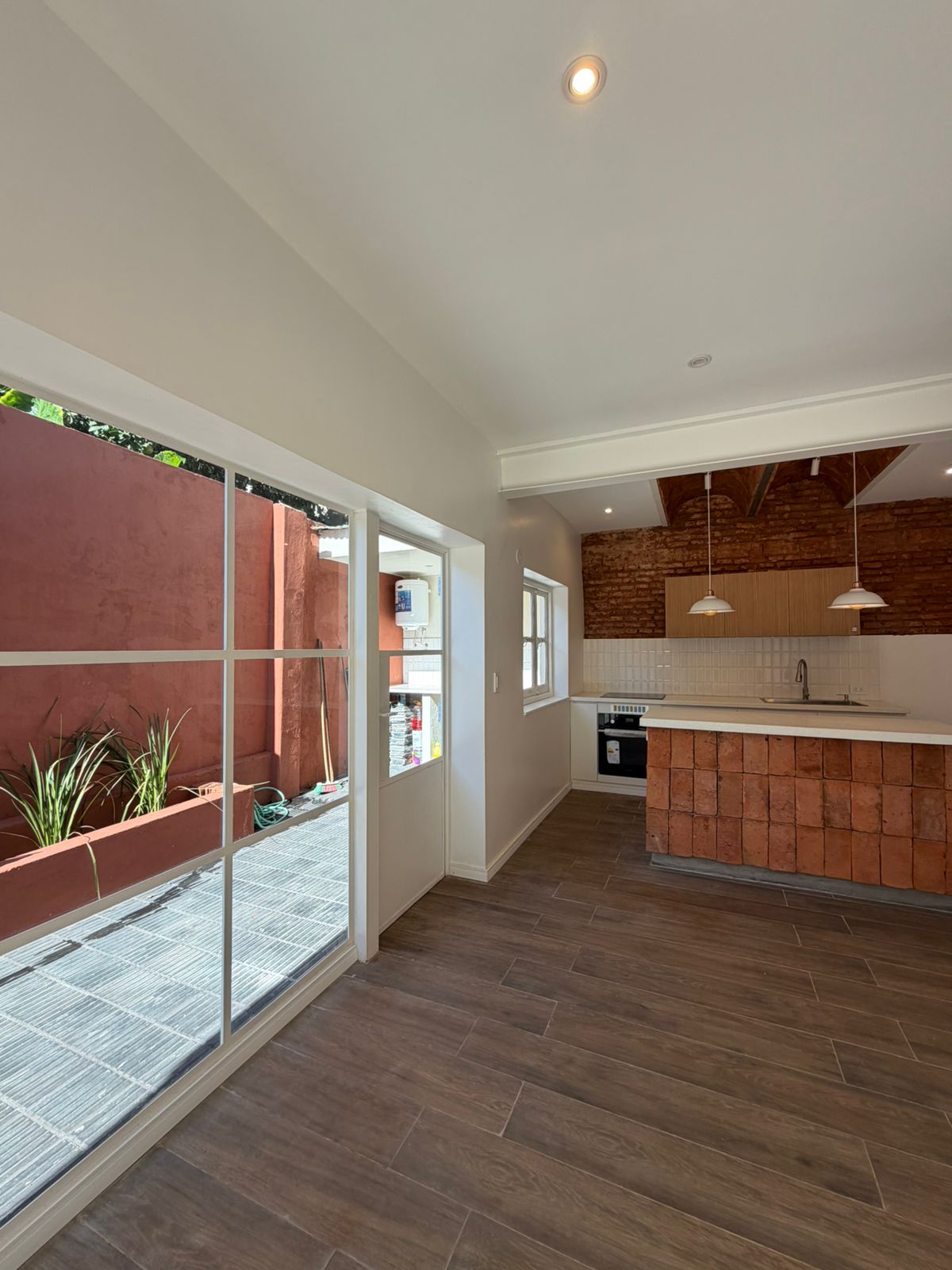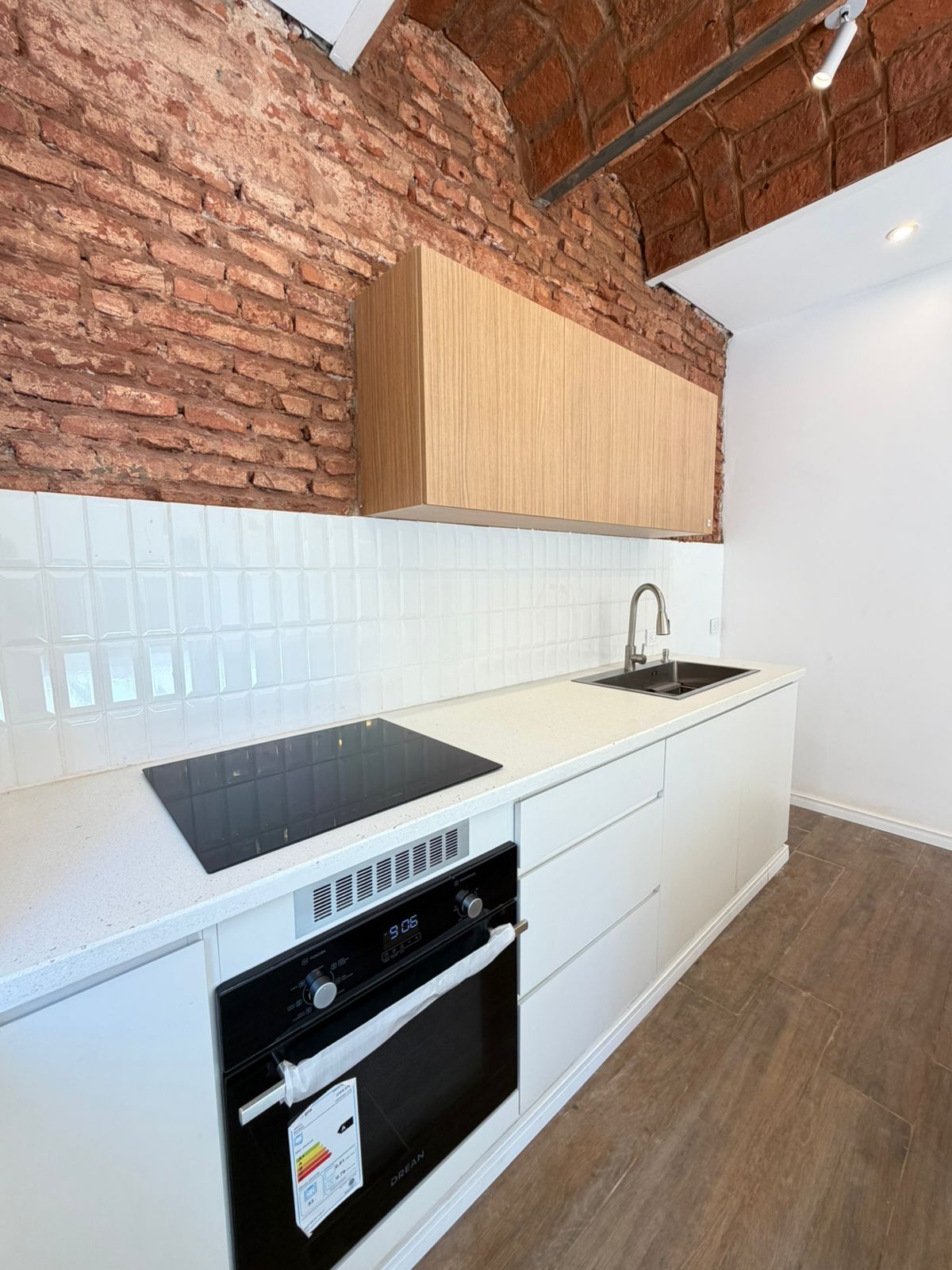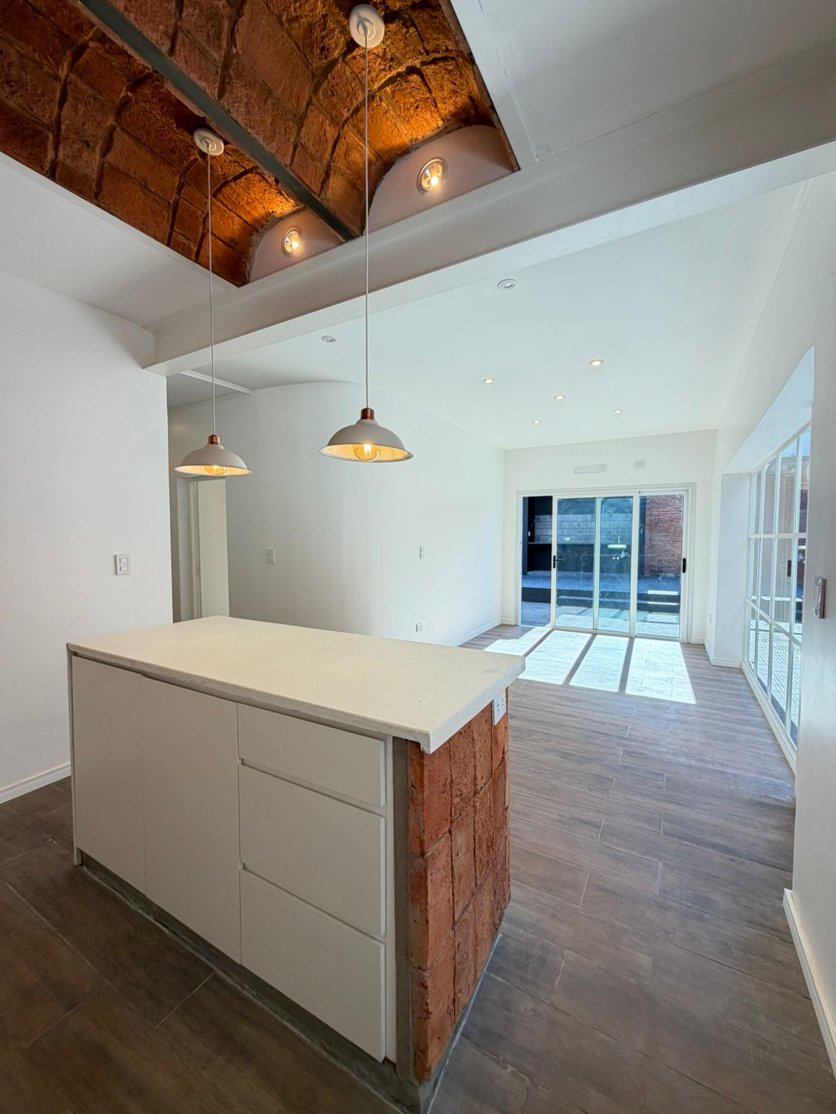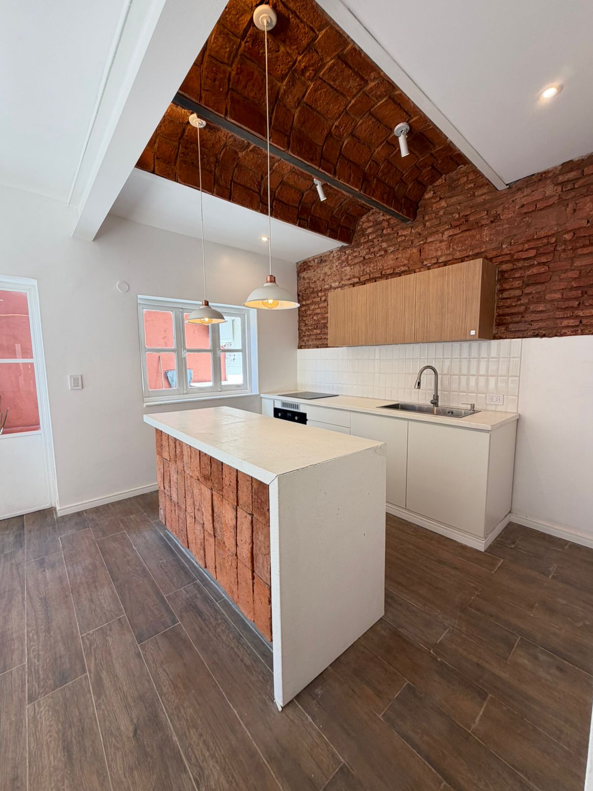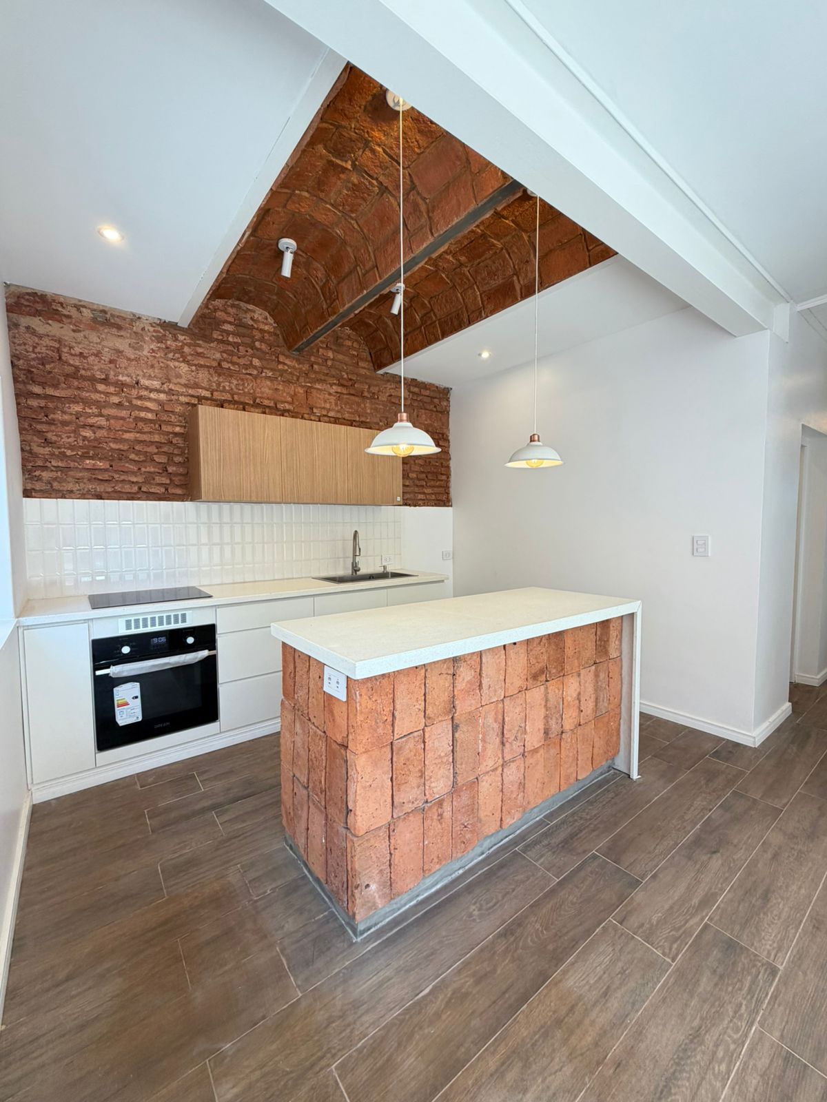 • Cocina moderna equipada con anafe y horno eléctrico, bobedillas y barra integrada al comedor.